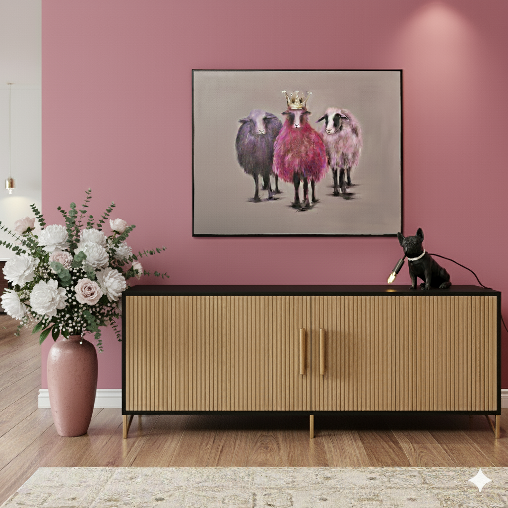Handgemaltes Acrylbild auf Leinwand. Das Bild Royale Sheep stammt vom Designer W. Waltersmann und zeigt 3 Schafe in leuchtenden Farben. Unregelmäßigkeiten in der Oberfläche und leichte Abweichungen in Form und Farbe sind charakteristische Merkmale dieser Handarbeit und stellen keine Mängel dar.