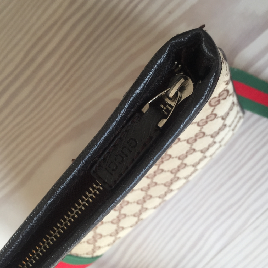 Sie besteht aus dem klassischen beigefarbenen GG-Monogramm-Canvas mit dunkelbraunen Lederdetails und dem ikonischen grün-roten Webstreifen.